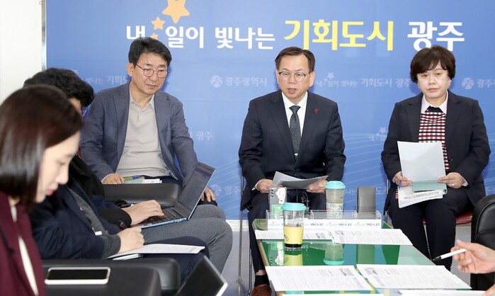 | ▲ 고광완 광주광역시 행정부시장이 18일 오전 시청 5층 기자실에서 출입기자들과 차담회를 갖고 불법광고물 정비 관련 설명 및 신고앱 사용법을 설명하고 있다. / 광주광역시 제공 |