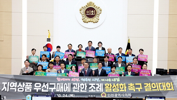 이날 인천시의회 의원들은 본회의 종료 후 결의대회를 열고 지역경제 활성화를 위해 지역 내 모든 공공기관이 지역상품 우선구매를 의무화하고 지역상품 구매촉진을 위한 적극적인 정책을 수립할 것을 인천시와 인천시교육청 등에 촉구했다.