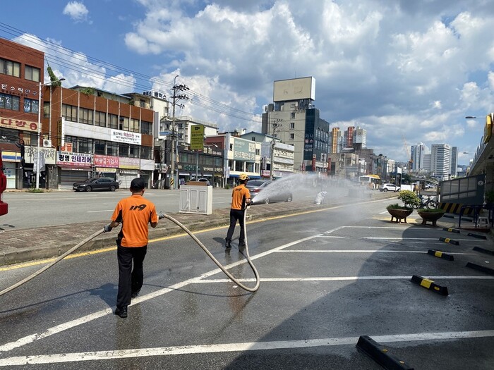 폭염 취약시간대인 오후 2시부터 3시까지 전통시장, 주요 행사장, 노약자 다수 활동지역에 소방차를 활용, 도로 살수 등 대민지원 활동을 펴고 있다.