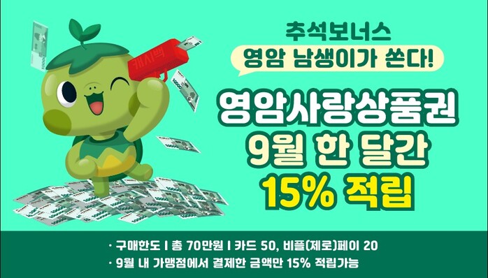 [영암=정찬남 기자] 전남 영암군(군수 우승희)이 오는 9월 한 달 동안 민족 대명절 추석 맞이 영암사랑상품권 15% 적립 이벤트를 진행한다.