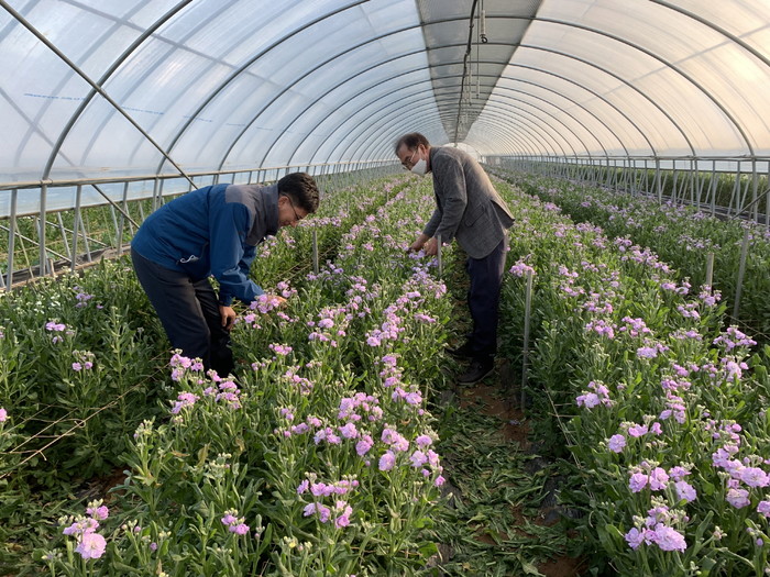 | ▲ 해남군농업기술센터 관계자들이 향기 좋은 저온성 품종 스토크 꽃 재배 하우스에서 작황을 살피고 있다. / 사진=해남군 제공 |