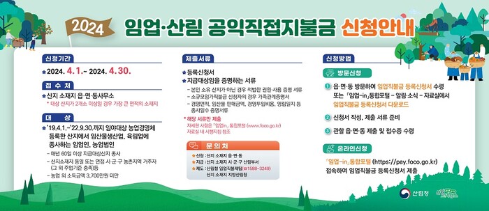 [강진=정찬남 기자] 전남 강진군은 ‘2024년 임업 · 산림 공익직접지불금(이하 ‘임업직불금’)’ 신청 · 접수를 4월 1일부터 30일까지 진행한다고 밝혔다.
