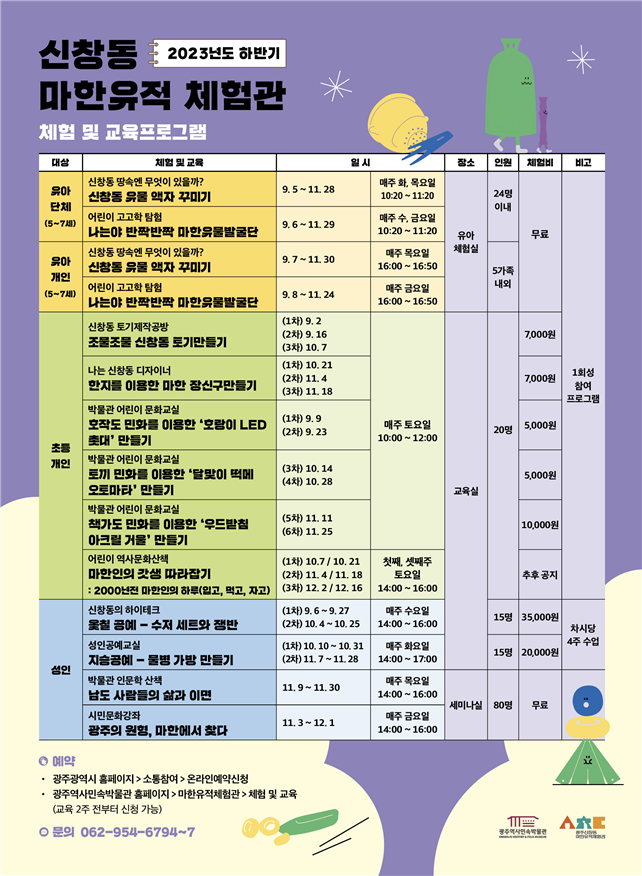 하반기 교육프로그램 수강료는 무료다. 단, 재료비는 수강생이 부담한다. 신청은 광주광역시 홈페이지 바로 예약에서 할 수 있다. 세부 일정 및 자세한 사항은 역사민속박물관 홈페이지, 신창동 마한유적체험관 블로그에서 확인할 수 있다.