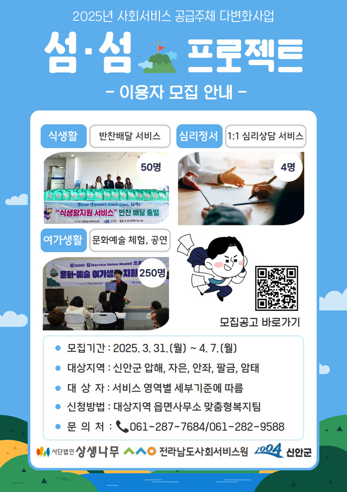 ‘섬·섬 프로젝트’는 중앙사회서비스원 ‘사회서비스 공급주체 다변화 공모사업’의 일환으로 신안군의 5개 읍·면(압해, 자은, 안좌, 팔금, 암태) 중위소득 150% 이하 연륙섬 주민에게 맞춤형 사회서비스를 우선 제공한다.