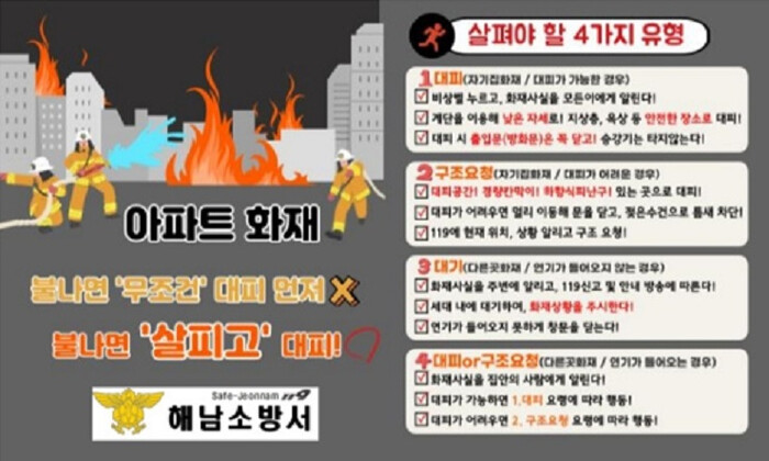 최진석 해남소방서장은 “아파트 화재는 대형 재난으로 이어질 수 있어 언제나 화재에 대한 예방과 관심이 중요하다”며 “아파트 피난안전대책이 습관적인 행동 요령으로 자리 잡도록 교육과 홍보를 지속하여 인명피해 최소화에 최선을 다 하겠다”고 전했다.