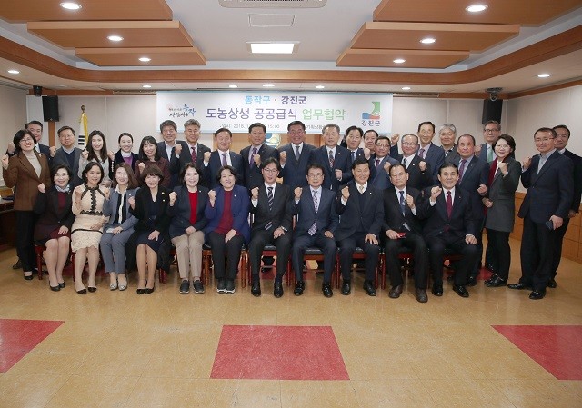 | ▲ 이승옥 강진군수(앞줄 좌측부터 8번)가 서울 동작구와 강진군이 도농상생 공급급식 업무협약식을 가진 후 관계자들과 세리머니를 하고 있다. / 사진=강진군 제공 |