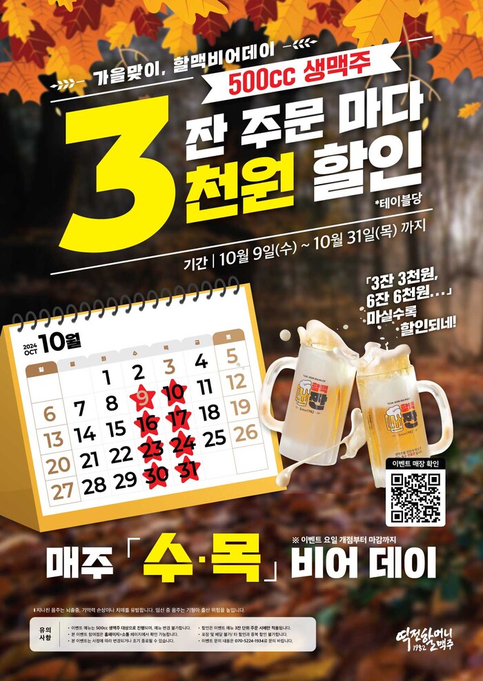 이번 행사는 오는 31일까지 매주 수요일과 목요일 총 8일간 이벤트 참여 매장을 방문하는 고객을 대상으로, 역전할머니맥주의 대표 시그니처 아이템인 ‘살얼음 생맥주 500cc’를 3잔 주문할 때마다 3000원씩 할인 적용한다.