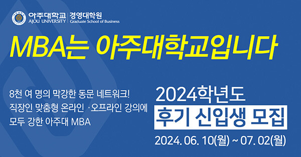 아주대 경영대학원의 2024학년도 2학기 신입생 모집에 대한 입학설명회와 자세한 사항은 아주대학교 경영대학원 홈페이지와 아주대 MBA 유튜브를 통해 확인이 가능하다.