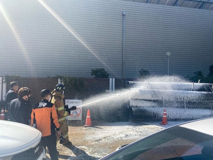 | ▲ 해남소방서 소방공무원들이 지난 19일 소방서 뒷편에서 카프(CAFS) 시연를 하고 있다. / 사진=해남소방서 제공 |