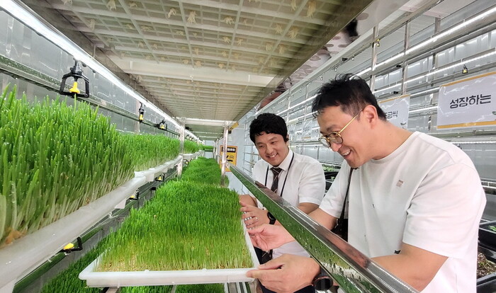 | ▲ CJ프레시웨이 관계자가 제이비팜 스마트팜에 방문해 채진웅 대표의 설명을 듣고 있다.(사진=제이비팜) |