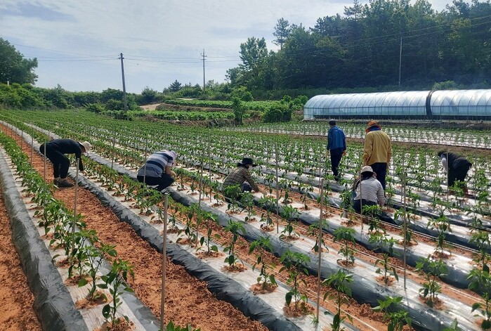 세 부서 20여 명의 직원들은 이날 6,600㎡의 고추밭에 지주대를 세우고 줄을 묶는 등 작업으로 농번기 인력난을 겪고 있는 농가의 일손을 덜었다.