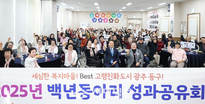 | ▲ 임택 광주광역시 동구청장(사진 가운데)이 지난달 28일 ‘2025년 백년동아리 성과공유회’에 참석한 지역 어르신들과 기념촬영을 하고 있다./ 광주광역시 제공 |