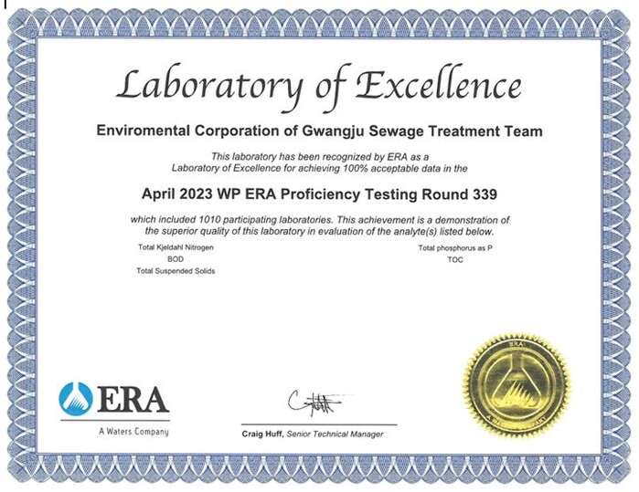 | ▲ 광주환경공단, 미국 ERA 주관, 국제 공인 인증 프로그램인 국제숙련도 평가 시험 수질 분야에서 ‘우수기관’ 선정 인증서 / 광주환경공단 제공 |
