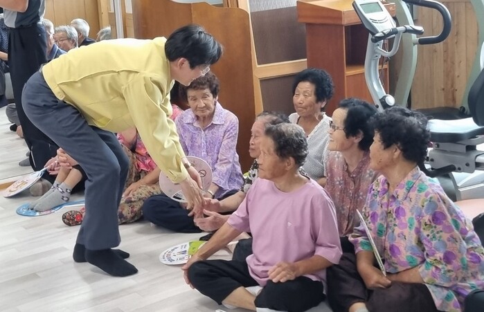 | ▲ 우승희 영암군수, 무더위 쉼터 경로당 방문 이용 어르신 안부 인사 / 영암군 제공 |