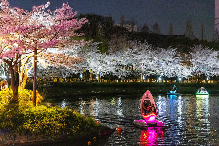 구는 석촌호수 산책로 2.6km 전구간에 경관 조명을 설치했다. 야간에도 벚꽃의 아름다움을 충분히 감상할 수 있다. 벚꽃 위로 비추는 하얀 조명이 꽃빛 터널을 연출하고, 화려한 벚꽃 게이트와 네온 포토존, 체험형 포토존 등이 산책로 곳곳에 설치되어 방문객에게 특별한 추억을 선물한다.