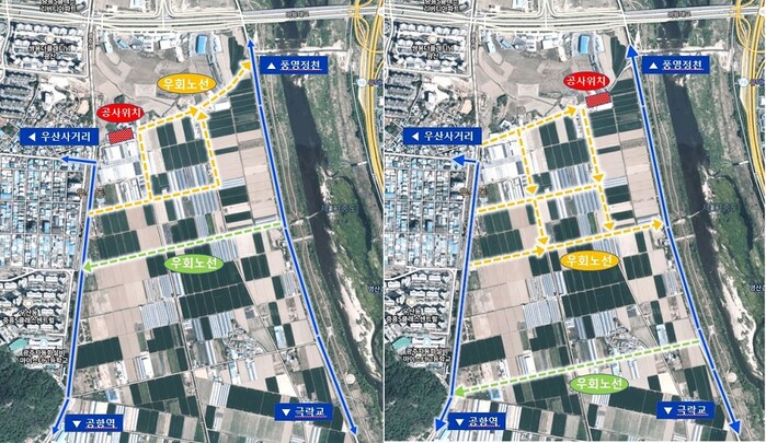 | ▲ 광산구 우산동 일대 송수관로 수계조절 제수밸브실 설치 공사 교통통제 위치도 / 왼 쪽 1단계 18~25일까지, 오른 쪽 2단계 26~31일까지 / 광주광역시 제공 |