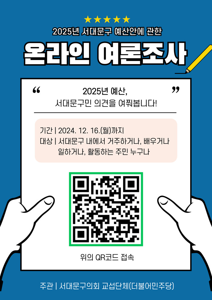 이번 여론조사는 내년도 예산안에 대한 주민 의견을 좀 더 다양하고 폭넓게 듣고자 서대문구의회 더불어민주당 원내교섭단체 주관으로 진행한다.