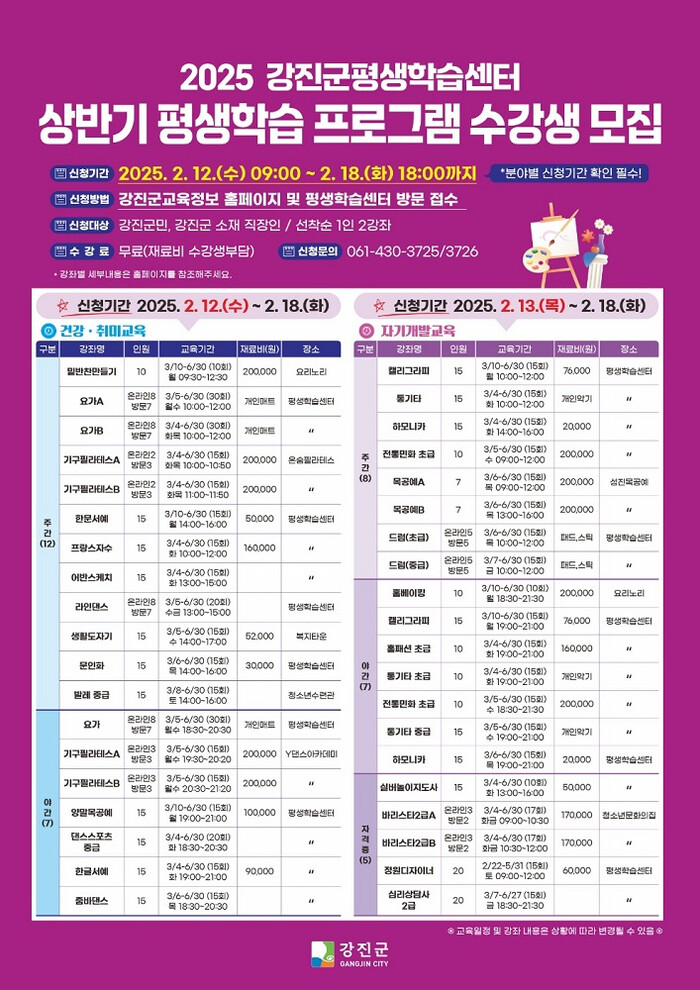 | ▲ 2025년 상반기 평생학습 수강생 모집 포스터 / 강진군 제공 |