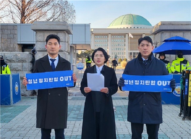 | ▲ 김보미 강진군의회 의장(가운데)이 지난 1월 25일 11시40분, 국회의사당 입구에서 기자회견을 열고, 더불어민주당 오현식 전국지방의원협의회장, 이현택 전남도당 청년위원장 및 강진군 청년당원들이 참석한 가운데 김승남 국회의원의 지역의원 줄 세우기 등에 대해 민주당의 엄중조치 촉구를 발표 하고 있다. / 강진군의회 제공 |