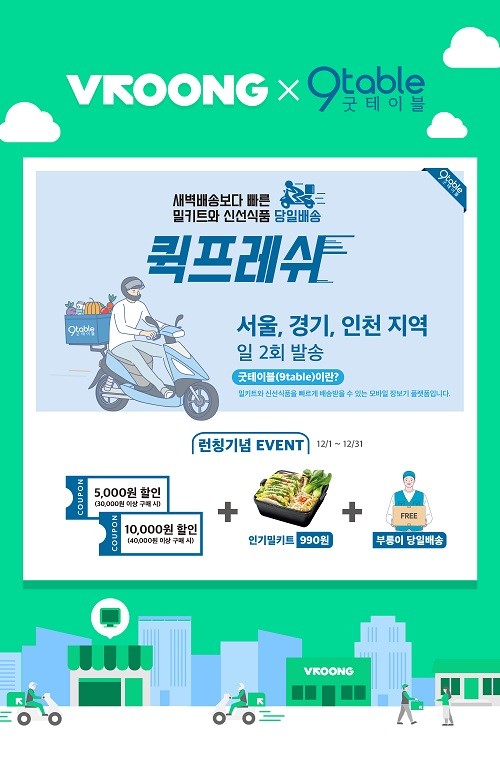 [시민일보 = 이승준 기자] IT 기반의 종합 유통물류 브랜드 ‘부릉(VROONG)’을 운영하는 메쉬코리아(대표 유정범)가 밀키트 전문업체 마이셰프(대표 임종억)의 모바일 장보기 플랫폼 ‘굿테이블(9table)’의 실시간 배송 서비스인 ‘퀵프레쉬’를 담당한다고 밝혔다.