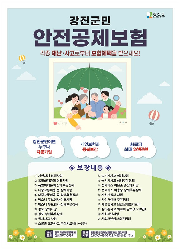 강진군에 주민등록을 둔 군민이나 등록 외국인은 일상생활에서 발생한 재난이나 사고로 피해를 입은 경우 사고 발생일로부터 3년 이내에 군민안전보험을 신청해 혜택을 받을 수 있다. 자세한 안내는 강진군청 안전재난교통과로 문의하면 된다.