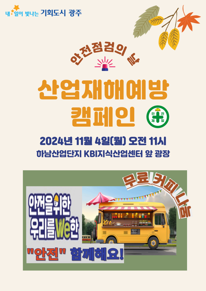 이번 캠페인은 ‘안전점검의 날’을 맞이해 지역 민간사업장을 대상으로 산업재해에 대한 인지도 제고를 위해 광주지방고용노동청 등 3개 관계기관 및 시민실천단과 합동으로 캠페인을 전개하고, 근로자분들의 노고를 위로하는 의미로 무료 커피차를 운영해 ‘나부터 안전 실천운동’을 추진할 계획이다.