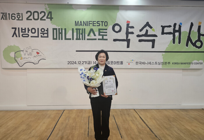 [남악=황승순 기자]전라남도의회 최미숙 의원(더불어민주당, 신안2)이 지난달 27일 열린 ‘2024 지방의원 매니페스토 약속대상’ 시상식에서 좋은 조례 분야 우수상을 수상했다.
