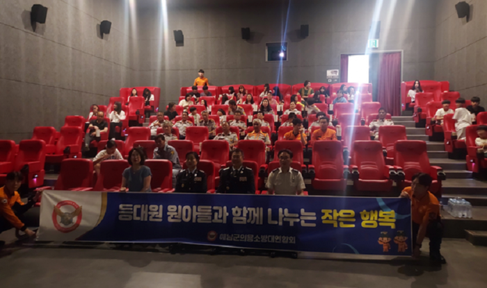 이날 작은 행복 활동으로는 의용소방대 연합회 25명, 해남소방서 직원 15명, 등대원 아이들 40명이 함께 소통하고 해남 시네마를 방문해 아이들과 연대감을 발전시키고 건전한 문화 체험의 기회를 제공해 주기 위해 영화 관람을 실시했다.