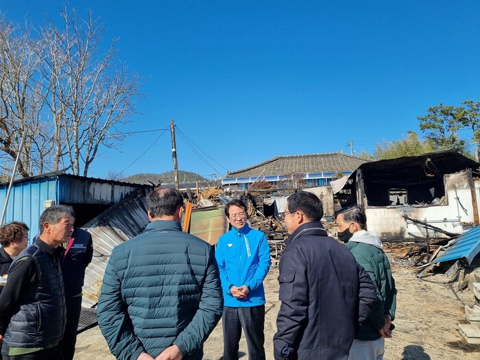[강진=정찬남 기자] 강진원 강진군수가 지난 14일 작천면 신기리 화재 현장을 방문해 주택 전소로 피해를 입은 김모씨를 위로했다.