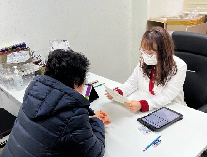 | ▲강진군 보건소 치매안심센터 전문 인력이 지역민을 대상으로 치매검사를 실시하고 있다, / 강진군 제공 |