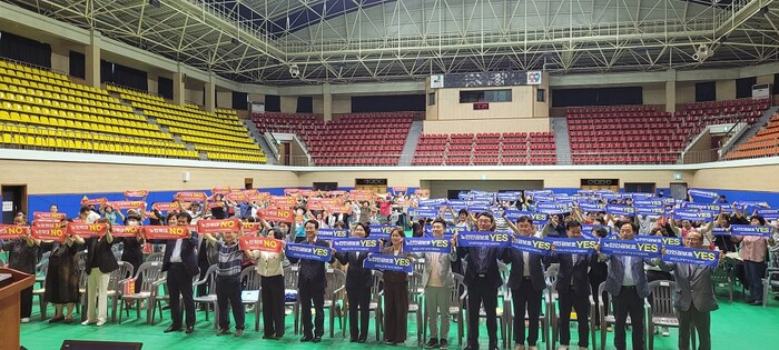 | ▲ 강진원 강진군수가 지난 11일, 강진군 제1실내체육관에서 열린 ‘제2회 요양보호사의 날 기념식’에 함께 참석한 김보미 군의장, 유경숙 부의장 등 군의원 전원과 국민건강보험공단 완도강진지사 장재원 팀장과 관내 요양보호사 등 관계자 250여 명과 노인인권보호 퍼포먼스를 실시하고 있다. / 강진군 제공 |