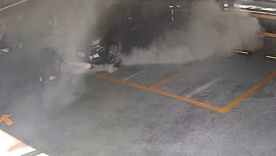그러던 중 주변 사람으로부터 주차장에 화재가 발생한 것을 전해 듣고 119신고와 동시에 본인 차량에 구비해 놓은 차량용 소화기로 초기진화 및 연소 확대 방지 활동에 나섰다.