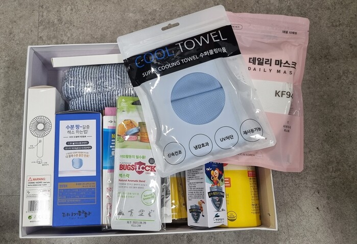 장애인들이 받은 꾸러미 안에는 이불, 손 선풍기, 유산균 등 총 12종의 폭염 예방 물품이 담겼다.