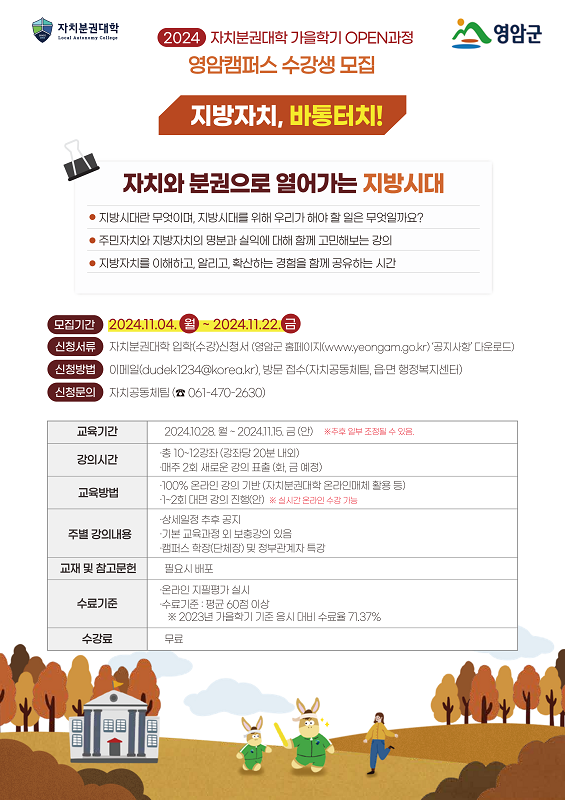 양은숙 영암군 자치행정과장은 “자치분권대학 가을학기 수강이 지역사회 발전에 기여하는 참여로 이어지길 바란다”고 전했다.