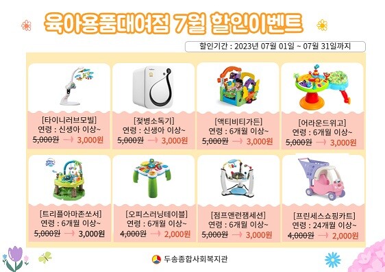 [부산=최성일 기자] 두송종합사회복지관(관장 김태형)은 사하구 다대2동 4지구BMC아파트 내 두송종합사회복지관 육아용품대여점 [아이꿈터]에서는 매월 대여료 반값 할인과 이용후기 작성 등 다양한 이벤트를 진행하고 있다.