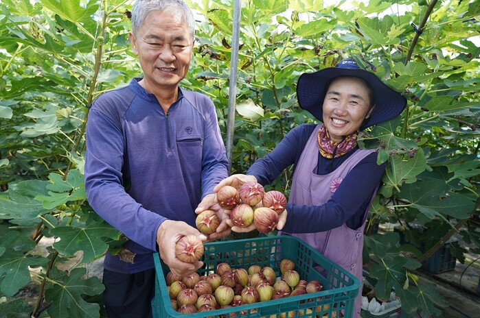 | ▲ 본격적인 무화과 수확 및 판매 하고 있는 해남군 송지면 군곡리 쌍둥이네 농장 황인복씨 부부 / 해남군 제공 |
