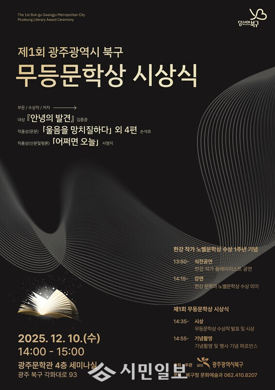 문인 북구청장은 축사를 통해 “한강 작가의 노벨문학상 수상 1주년이라는 뜻깊은 시기에 제1회 무등문학상 시상식을 개최하게 되어 더욱 의미가 크다”며, “수상자들께 진심으로 축하를 전하며 앞으로 무등문학상이 권위 있는 문학상으로 자리매김할 수 있도록 지원을 아끼지 않겠다”고 말했다.