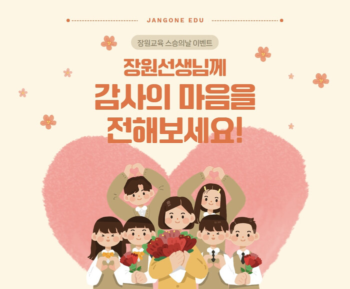 스승의 날은 교육을 위해 헌신하는 선생님들께 존경과 감사의 마음을 전할 수 있는 의미 깊은 날이다. 장원교육은 아이들을 향한 사랑과 늘 바른 교육을 위해 힘써주시는 장원교육 선생님께 존경과 감사의 마음을 전하기 위해 스승의 날 감사 이벤트를 지난 5월 8일부터 15일까지 진행했다.