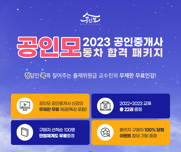 이에 2023년 제34회 공인중개사 시험일정을 준비하는 이들 역시 비슷하거나 늘어날 것으로 예상, 공인모에서는 공인중개사 무료인강과 함께 <2023 공인모 공인중개사 합격 패키지>를 진행한다.