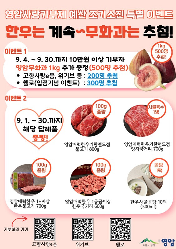 이영주 영암군 홍보전략실장은 “짧은 기간에도 출향인 등 전국 각지의 기부자분들이 큰 관심을 보내주신 덕분에 이벤트가 성황리에 마무리됐다. 추가로 진행되는 ‘한우는 계속, 무화과는 추첨’ 이벤트에도 많은 관심과 성원 바란다”고 전했다.