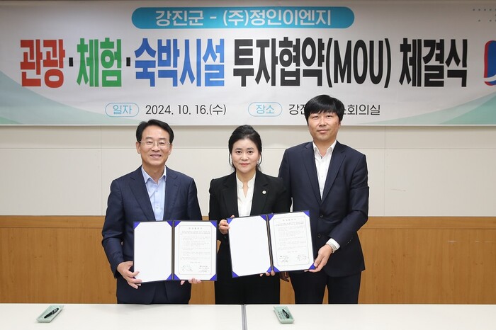 [강진=정찬남 기자] 전남 강진군이 지난 16일 군청 소회의실에서 (주)정인이엔지와 분홍나루 일원 발전을 위해 농어촌 관광휴양시설 조성사업 투자협약을 체결했다.