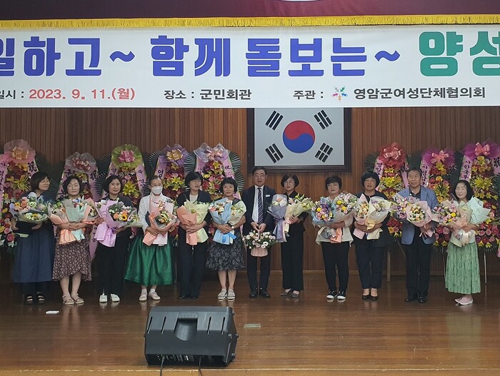 | ▲ 영암군, 지난 11일 군민회관에서 ‘2023년 양성평등주관 기념행사 개최 후 관계자 꽃다발 증정 기념촬영 / 영암군 제공 |
