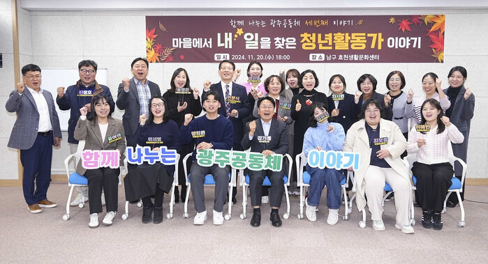 광주시는 20일 오후 광주 남구 효천생활문화센터에서 마을청년활동가 20여명을 만나 ‘마을에서 내 일☆을 찾은 청년활동가 이야기’를 주제로 ‘함께 나누는 광주공동체’ 세 번째 이야기장을 열었다.