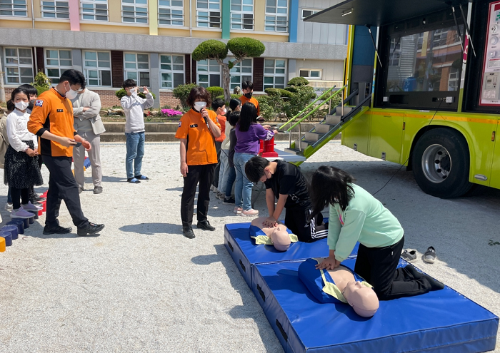 이동안전체험차량 교육은 어린이들에게 각종 재난 상황을 직접 체험하게 해 재난 대응능력을 배양시키고, 일상생활속 안전문화를 조성하기 위해 운영하는 프로그램으로 ▲3D영상체험, ▲열, 연기대피, 지하철 문 개방, 지진, 비상탈출 체험, ▲소화기체험, ▲심폐소생술 실습 등을 통해 쉽고 재미있게 진행됐다.