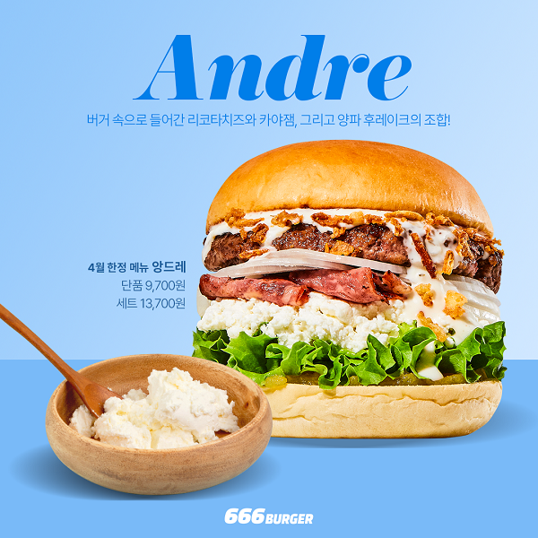 ‘앙드레’는 두툼한 150g의 소고기 패티와 리코타 치즈, 양파후레이크가 들어간 한정 메뉴로 육즙이 흐르는 소고기 패티의 담백함과 신선한 리코타 치즈의 깔끔한 맛, 양파후레이크의 바삭한 식감이 잘 어우러진 수제버거이다