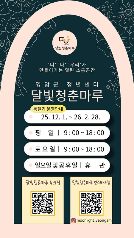 김선미 영암군 인구청년과장은 “청년들이 안전하게 달빛청춘마루를 이용할 수 있도록 부득이하게 겨울철 운영 시간을 줄이게 됐다. 내년 3월부터는 다시 야간 운영을 재개해 청년 활동을 지원하겠다”고 밝혔다.