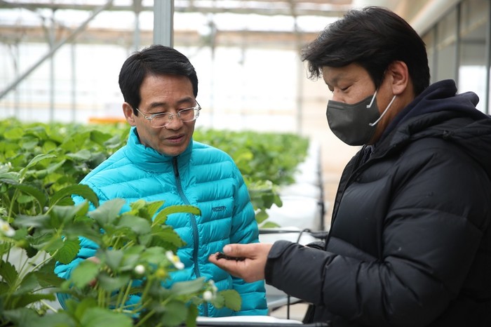 | ▲ 강진원 강진군수가 귀농해 강진농업을 이끌어 가고 있는 청년 농업인 최영수 딸기 재배 농가를 방문해 대화를 나누고 있다. / 강진군 제공 |
