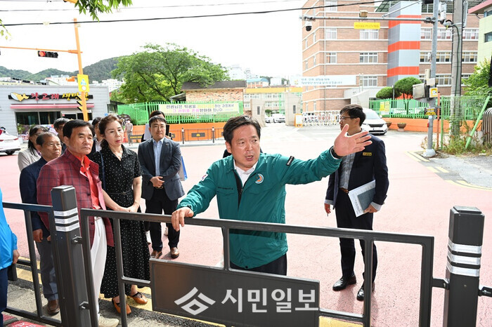 | ▲ 김병내 광주광역시 남구청장이 민원현장인 관내 초등학교 앞 안전시설 점검하고 있다. / 자료사진 = 남구청 제공 |