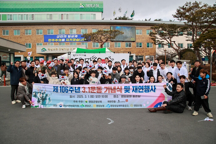 | ▲ 영암군, 영암군청년회와 지난 1일 군청 입구에서 ‘제106주년 3·1운동 기념식 및 재현행사' 기념촬영 / 영암군 제공 |