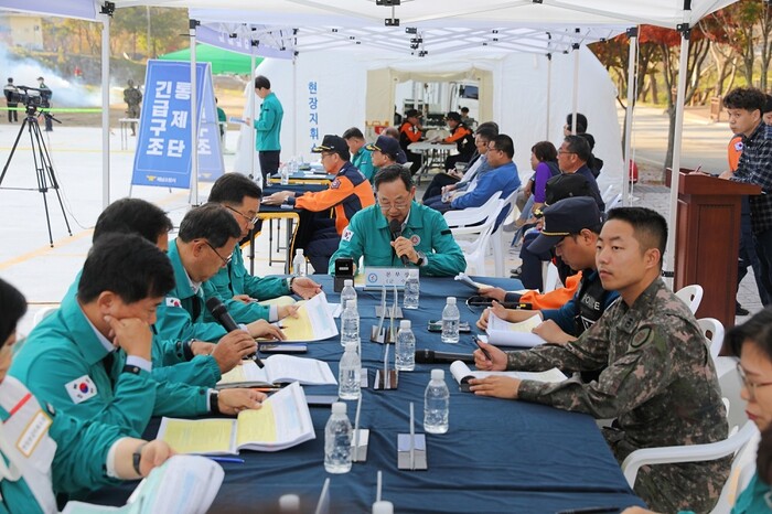 | ▲ 명현관 해남군수(가운데)가 해남군이 가을철 잦은 산불에 대비하기 위해 지난 10월 31일 삼산면 구림리에서 2023 재난대응 안전한국훈련을 주재하고 있다. / 해남군 제공 |